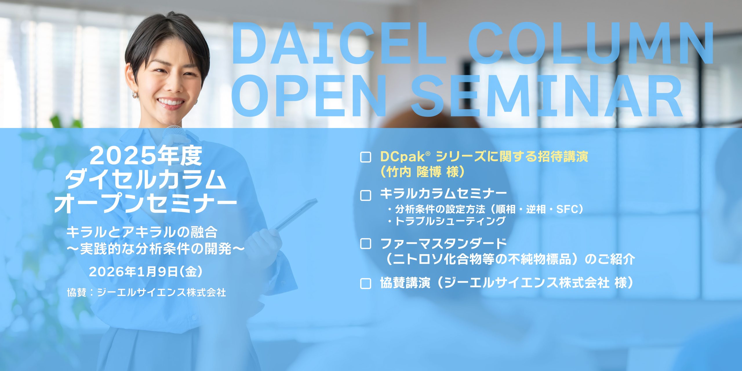 本セミナーでは、キラルカラムの使用方法やトラブルシューティング、DCpakシリーズ(アキラルカラム)について解説いたします。