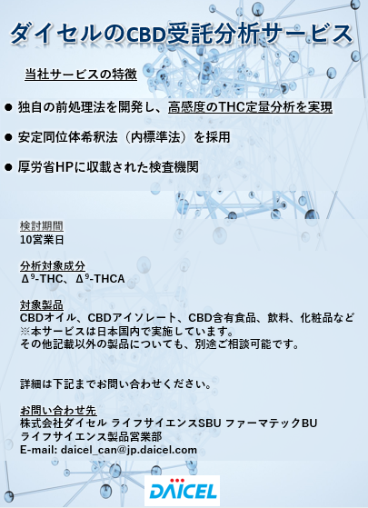 厚生労働省が公開したΔ9-THCの含有量に関する検査が可能な機関(001576978.pdf)にも掲載さているように、当社も受託分析サービスを開始いたしました。