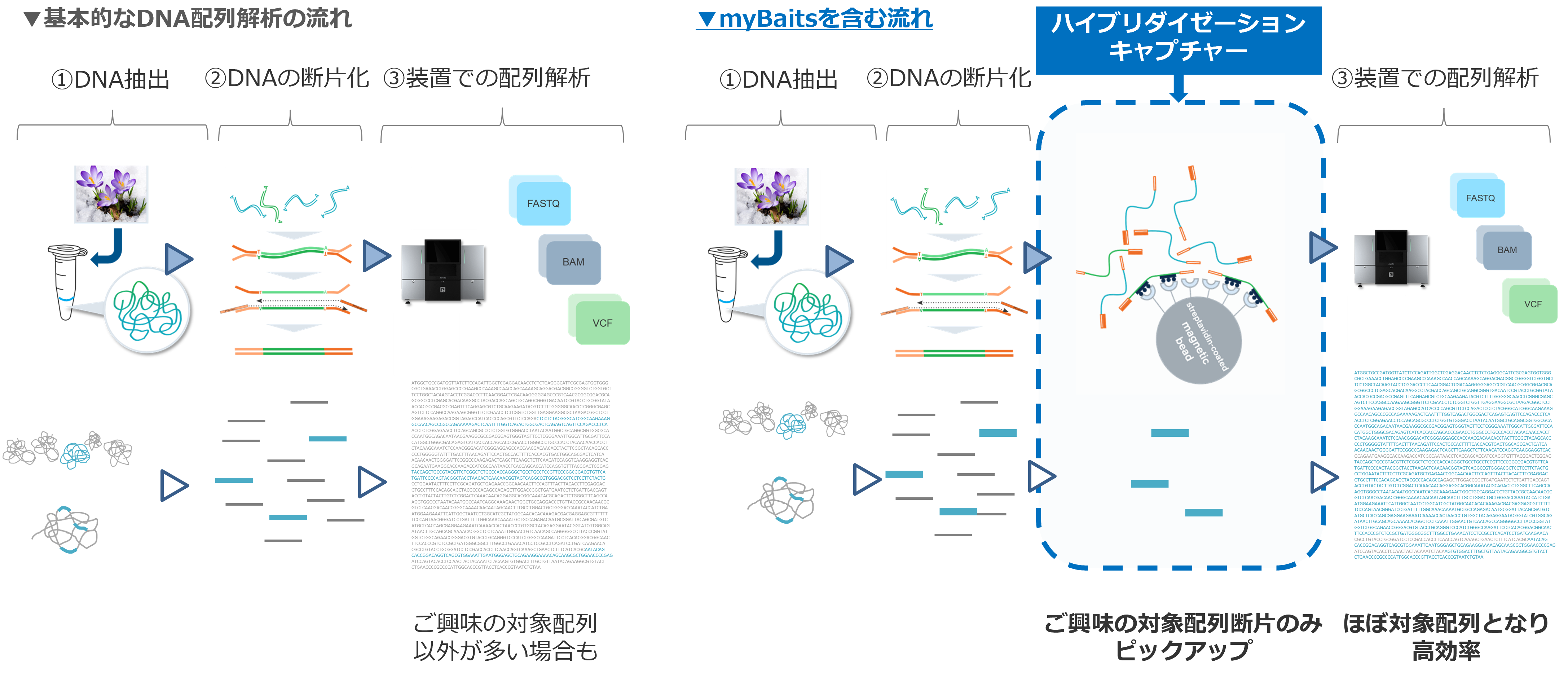 そんな時にご利用いただきたいのが、この myBaits です。myBaits は所望のDNA領域に相補的に結合するよう設計された短い核酸がベースとなっています。さらに、各核酸にBiotin分子が修飾されています。これを配列解析の直前にサンプルと混合いただくことで、myBaitsが結合した所望のDNAのみを、Biotin分子特異的な結合ビーズを使うことで回収できます。この回収されたDNAのみを解析にもち込むことで、解析効率の向上、場合によっては検出感度や解析確度の向上が期待できます。