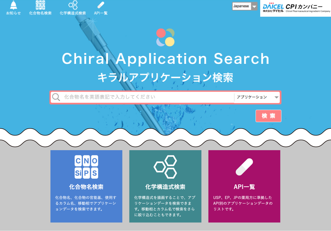 ダイセルでは2,000 例以上の化合物の光学異性体 分離例を掲載し、検索できる、世界最大級の分離例検索サイトをご用意しております。